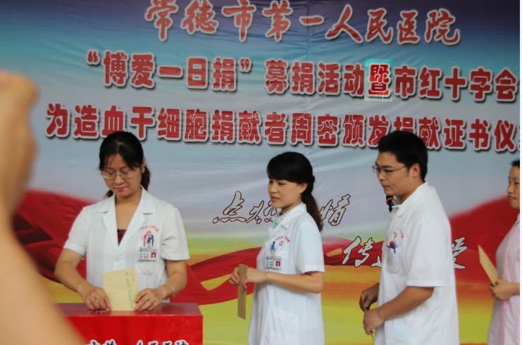 2012年7月17日上午9点30分,在常德市第一人民医院门诊大厅前,常德市第一人民医院员工代表及红十字会工作人员举行了博爱满人间现场募捐及为周密同志颁发捐献证书仪式。第一人民医院党委书记屈晶华对“博爱满人间”活动进行了总动员、市红十字会专职副会长张洪同志对第一人民医院的爱心捐赠致答谢词,并对医院员工的无私奉献精神进行了高度赞扬。此次活动还为无私捐献造血干细胞挽救白血病人的周密同志举行了颁奖仪式。