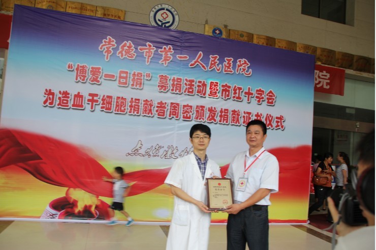 2012年7月17日上午9点30分,在常德市第一人民医院门诊大厅前,常德市第一人民医院员工代表及红十字会工作人员举行了博爱满人间现场募捐及为周密同志颁发捐献证书仪式。第一人民医院党委书记屈晶华对“博爱满人间”活动进行了总动员、市红十字会专职副会长张洪同志对第一人民医院的爱心捐赠致答谢词,并对医院员工的无私奉献精神进行了高度赞扬。此次活动还为无私捐献造血干细胞挽救白血病人的周密同志举行了颁奖仪式。